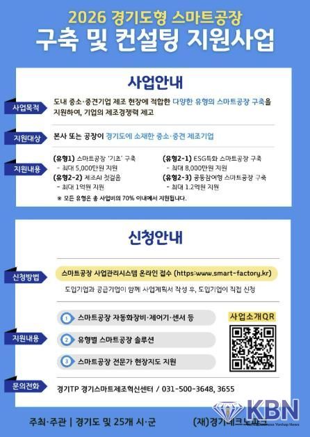 KBN 한국벤처연합뉴스 오경호 기자 | 수원특례시가 경기도와 함께 ‘2026년 경기도형 스마트공장 구축 및 컨설팅 지원사업’ 참여 기업을 공모한다. 경기도 22개 시군 소재 중소제조기업을 지원하는데, 수원시 기업은 4개사를 선정할 예정이다.