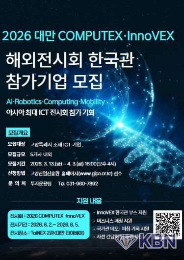 KBN 한국벤처연합뉴스 구일암 기자 | 고양산업진흥원이 ‘2026 대만 COMPUTEX‧InnoVEX ’참가 기업을 모집한다고 18일 밝혔다.