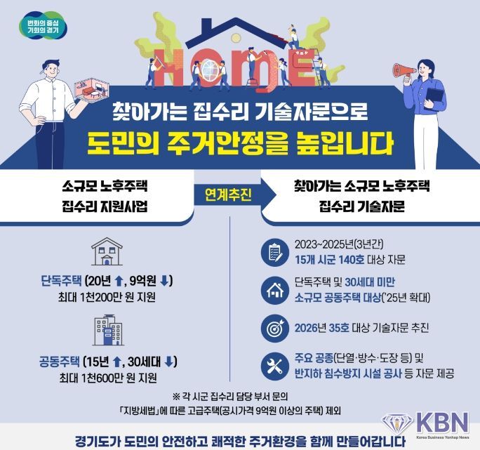 KBN 한국벤처연합뉴스 구일암 기자 | 경기도가 소규모 노후주택에 거주하는 도민들의 집수리 고민을 덜어주기 위해 찾아가는 무료 기술자문을 올해는 35곳에서 추진한다.