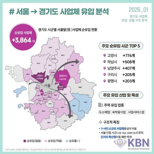이 기간, 서울에서 경기도로 이동한 전체 순유입 사업체 3,864개 중 고양시가 약 20%를 차지한다. 뒤를 이어 하남시 508개, 남양주시 407개 등으로 나타나 고양시가 상대적으로 높은 사업체 유입 규모를 보였다.