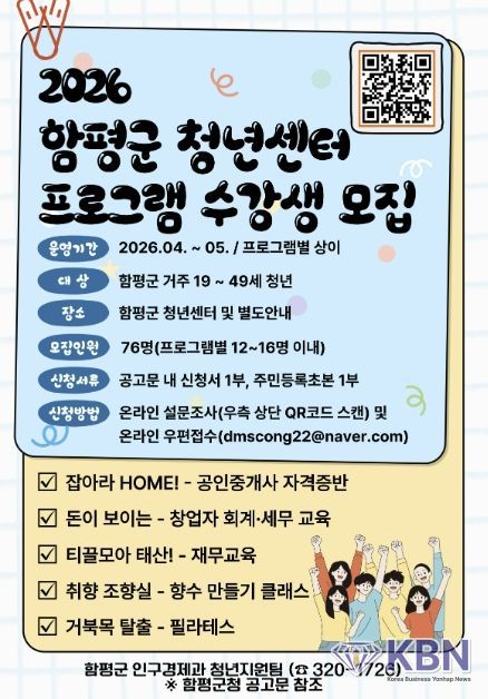 함평군은 24일 “‘2026년 상반기 청년센터 프로그램’의 참여자를 선착순으로 모집한다”고 밝혔다.